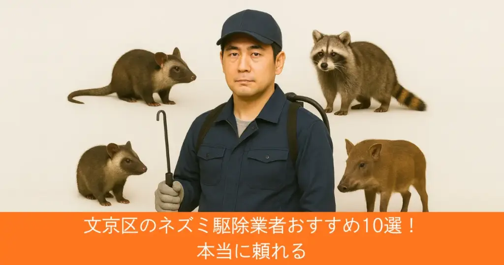 この記事では文京区のネズミ駆除業者を紹介しています。 文京区では、ネズミの侵入や騒音・フン害などに関する相談が増えており、害獣駆除に対応している専門会社も複数あります。 文京区で依頼可能なネズミ駆除サービスの特徴を整理していますので、ぜひ... -
