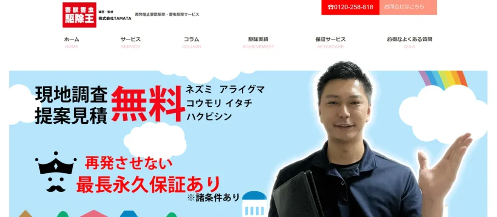 また、現地調査と見積りが無料で、料金の目安も公開されていて「害獣駆除、税込22,000円〜」と明朗会計なのも安心ポイント。